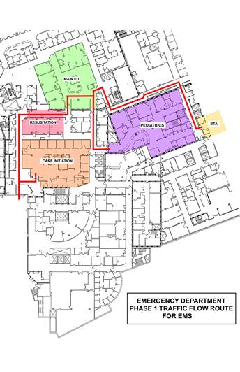 For reference, please see the Emergency Department Phase I EMS Traffic Flow map below and the new Emergency Department ambulance entrance photo below.