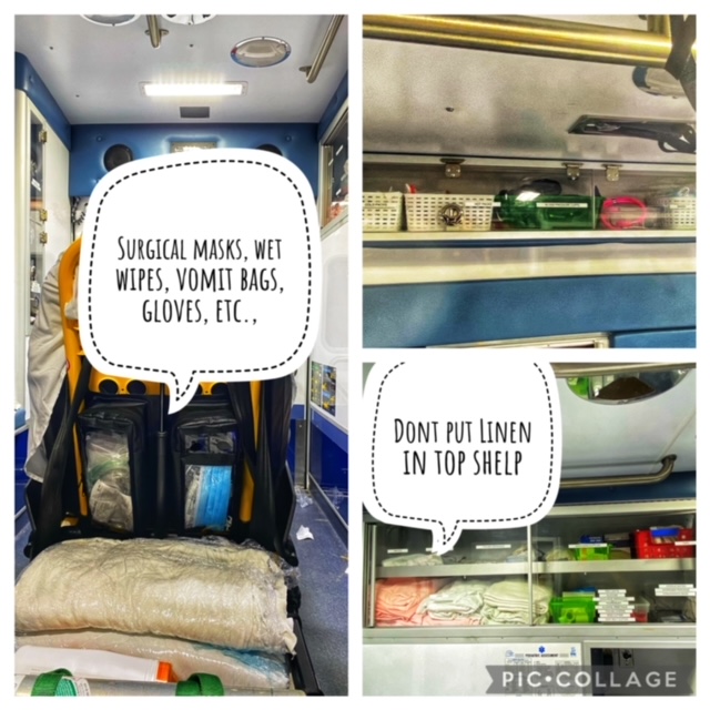 1. For convenience we have placed surgical masks, gloves, sani-wipes, vomit bags, NRB, NC in the back pouches on the stretcher.